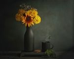 Кувшин с цветами и стаканчик кофе..
